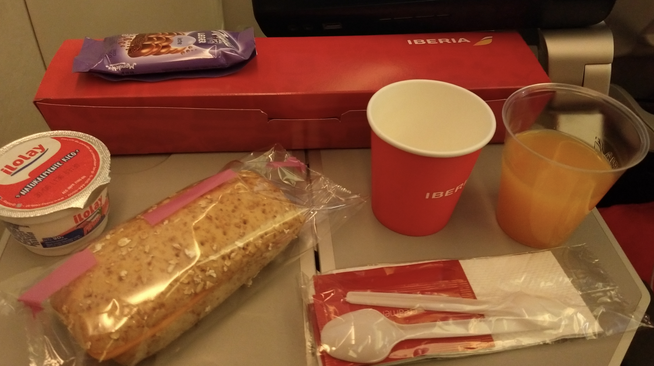 Una hora antes de aterrizar pasaron con el desayuno que estaba muy bien presentado en una cajita con un yoguth, un sandwich de jamón y queso y un chocolate al que le sumamos café y jugo de naranja.