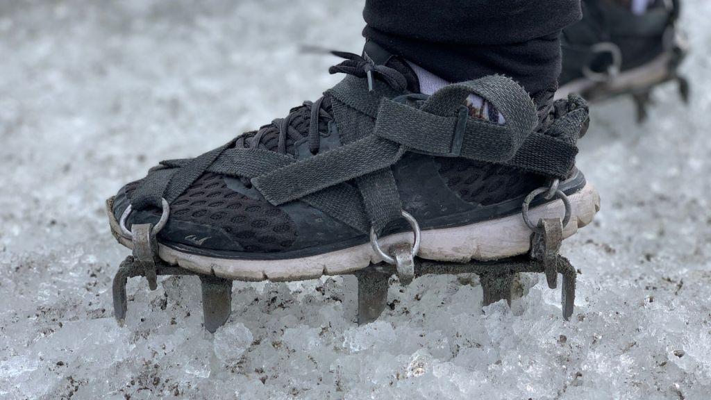 Nos dieron los cascos y nos colocaron los grampones que son como pinches que te van clavando en el hielo con cada paso que vamos dando. Tras la explicación de cómo se debe caminar en el hielo, los cuidados y precauciones a tener arrancamos la travesía.